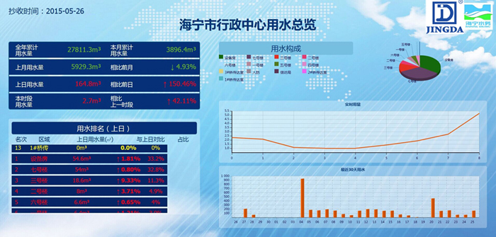 In 2015, the Haining Municipal Administrative Center built the first public institution water resources dynamic balance monitoring system, which launched a beautiful battle for the construction of "Five Water Governance" in Haining City! It not only greatly improved the management level of water resources use and reduced the production and sales gap, but also truly achieved technical water saving and efficient water control! The project was jointly undertaken by Haining Water Group and Hangzhou Jingda Company. Through pipeline network transformation and technical means, real-time remote meter reading management of water use, real-time monitoring of water balance of multi-level water meters, and real-time warning of abnormal leakage were realized, which greatly improved the management level of water resources use!